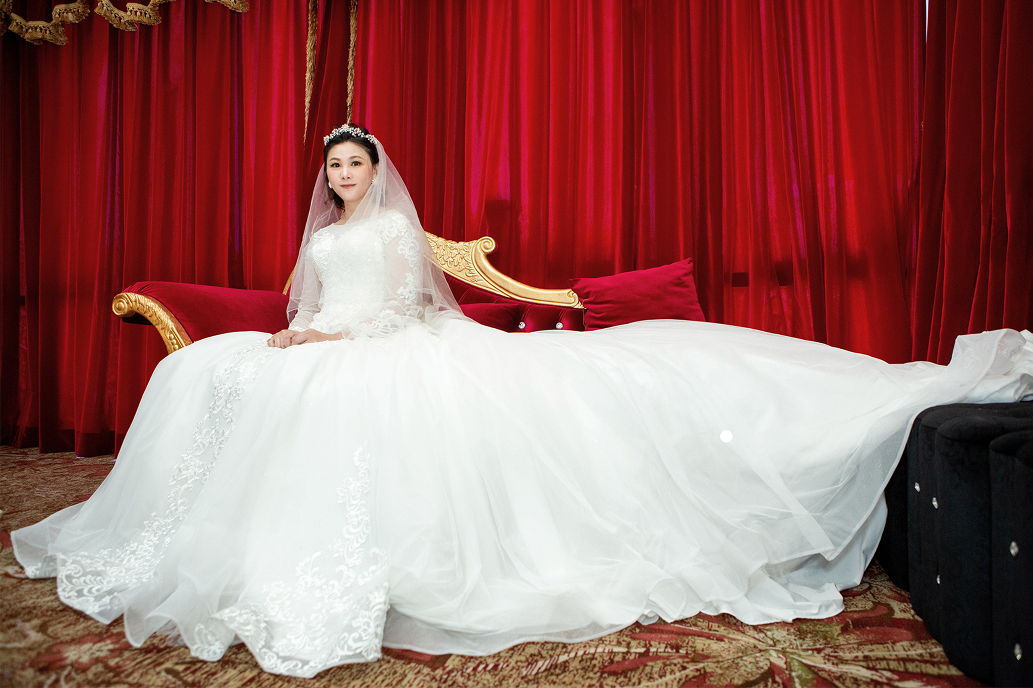紅色的絨布窗簾,和我的純白婚紗形成強烈的對比。婚禮攝影師阿崑讓我像女王般氣勢如虹,神聖又浪漫的婚禮即將開場。