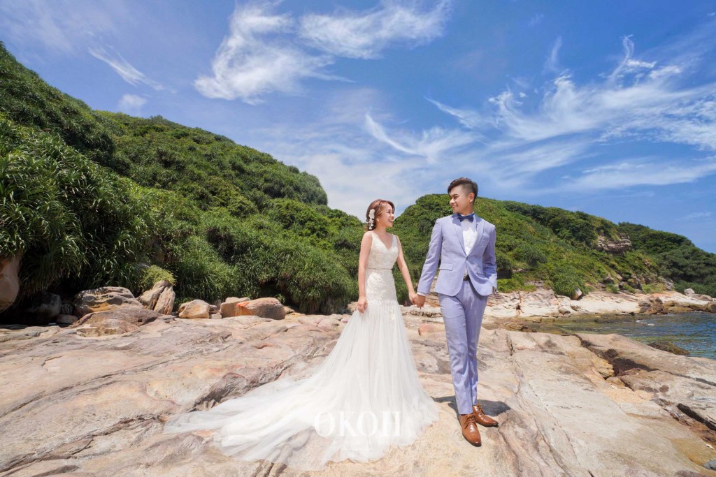 以沙灘為背景拍出的婚紗是浪漫唯美感,那以岸邊的「礁岩」作為背景的話,就會是一種有氣勢的美感了。因為海邊的礁岩線條有著獨特的天然美,所以能夠讓照片的構圖更加突出特別。OKOH推薦想要拍這樣婚紗的新娘們,可以選擇「大拖尾」的婚紗禮服,這樣能夠和岸邊的景色相輔相成,也能夠讓新娘有更強的氣場。另外也可以選擇「裸紗」型的婚紗禮服,若隱若現的感覺正好能微妙調節整體氛圍,讓新娘有氣勢又性感,卻不失迷人的女人味。